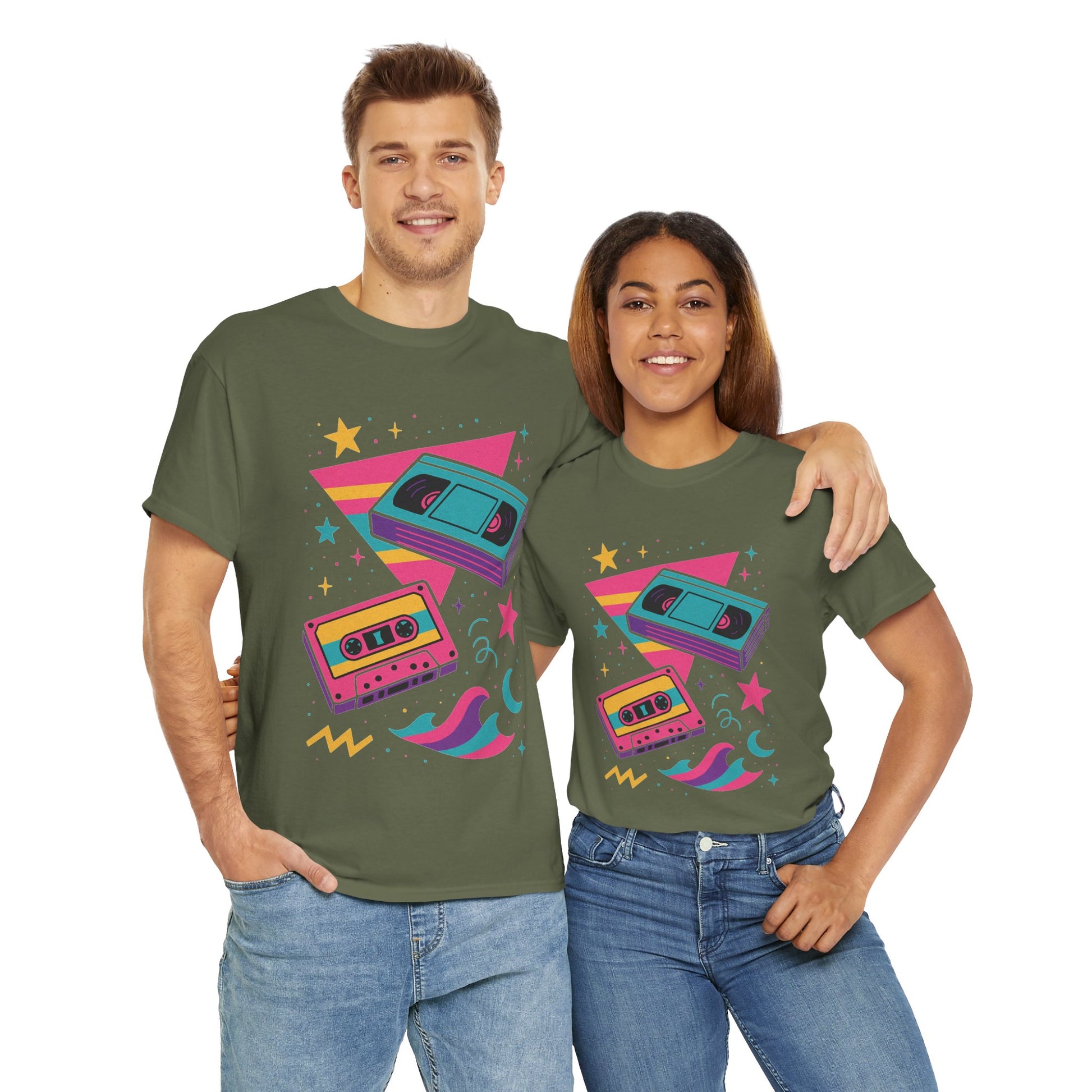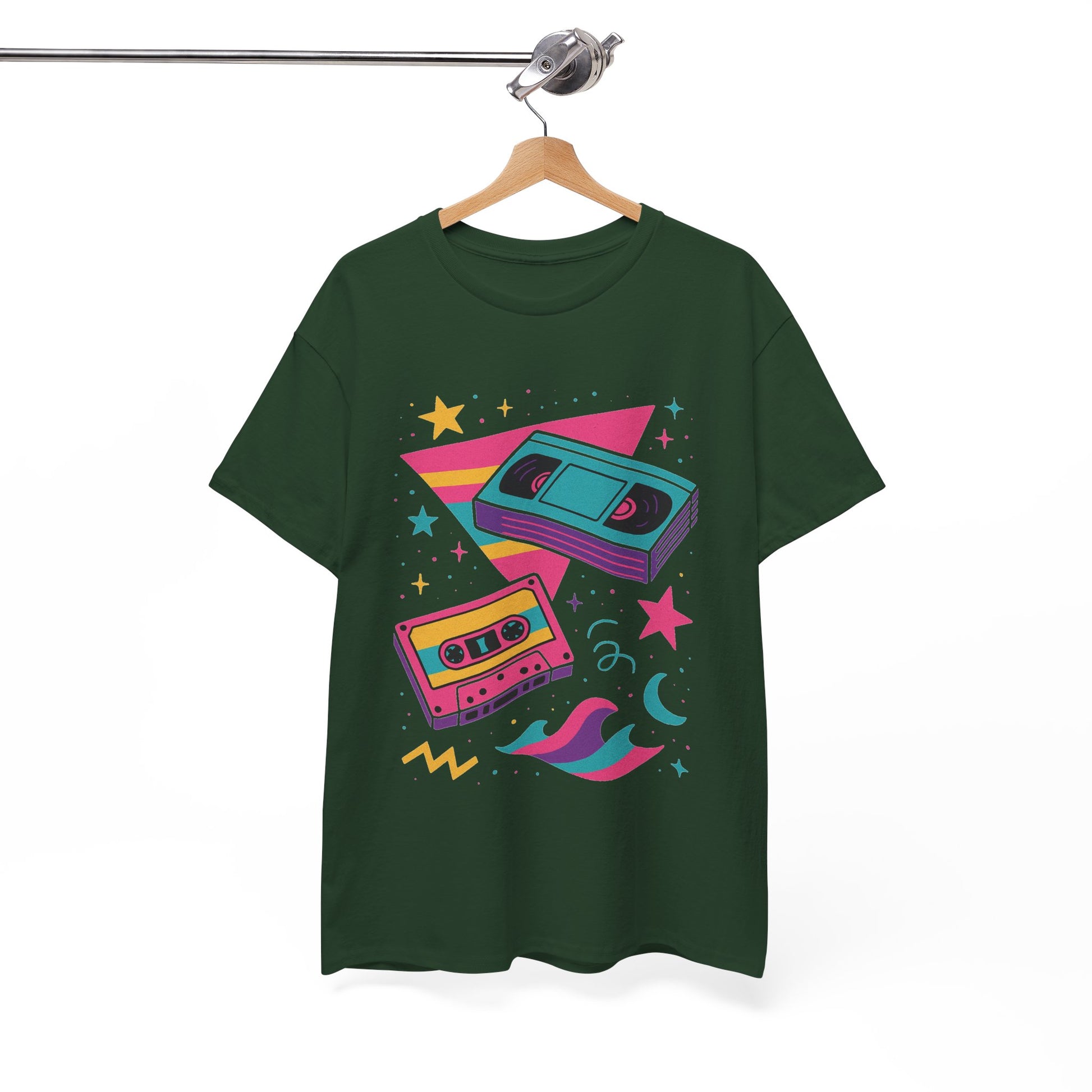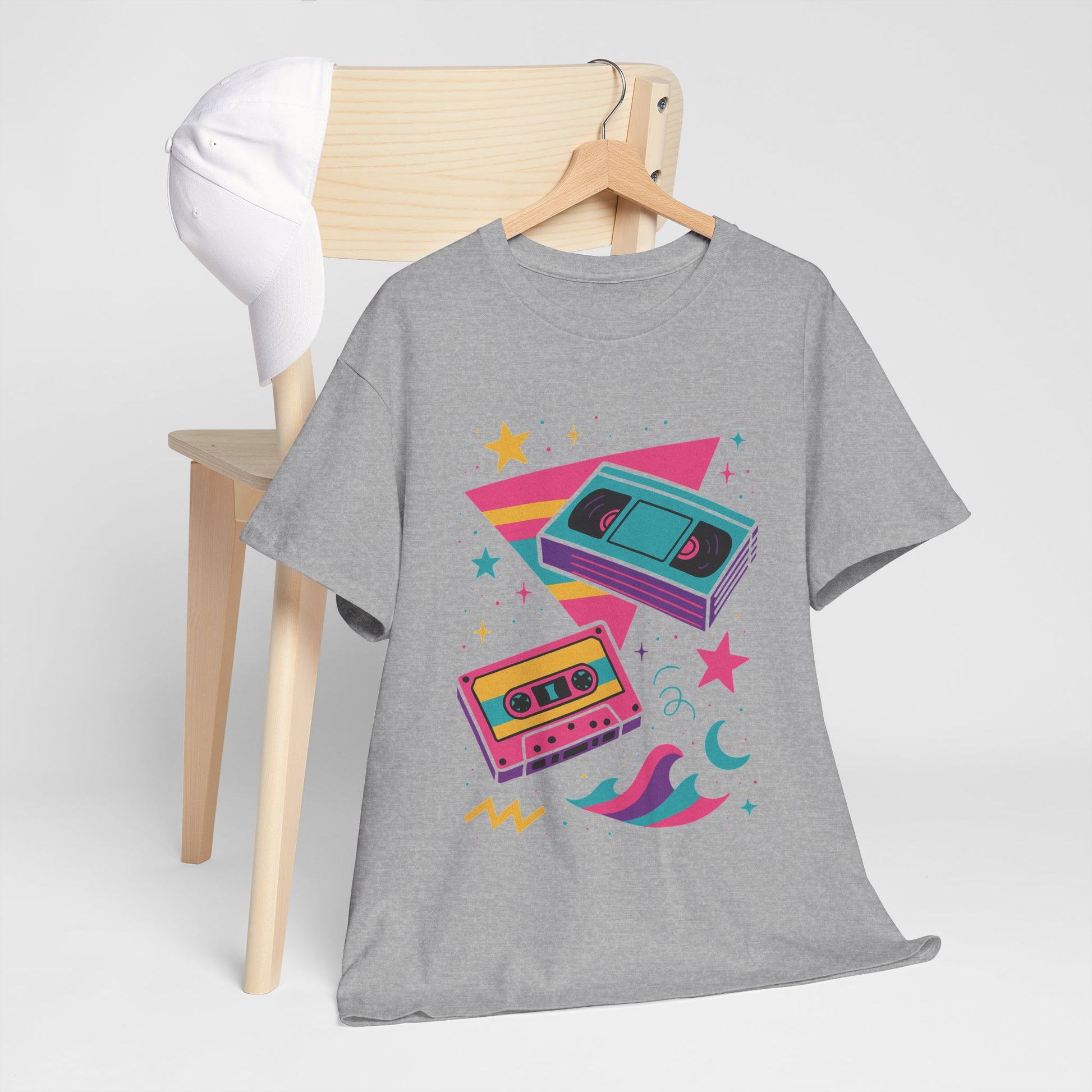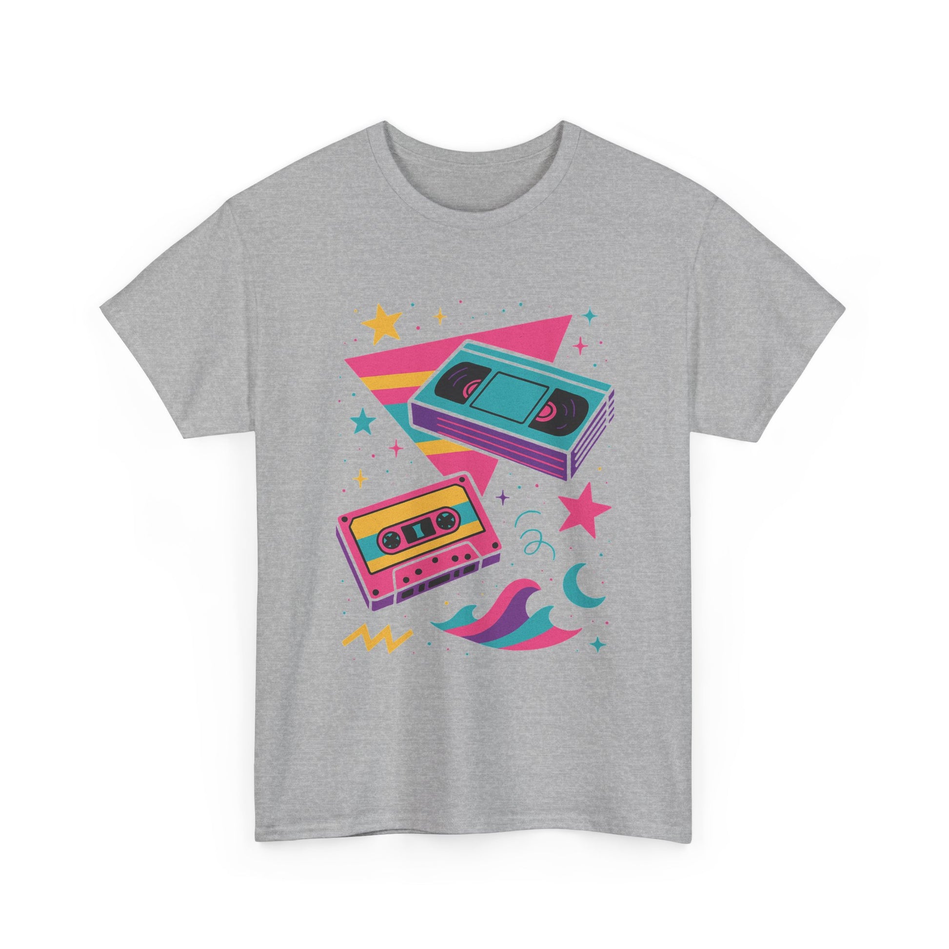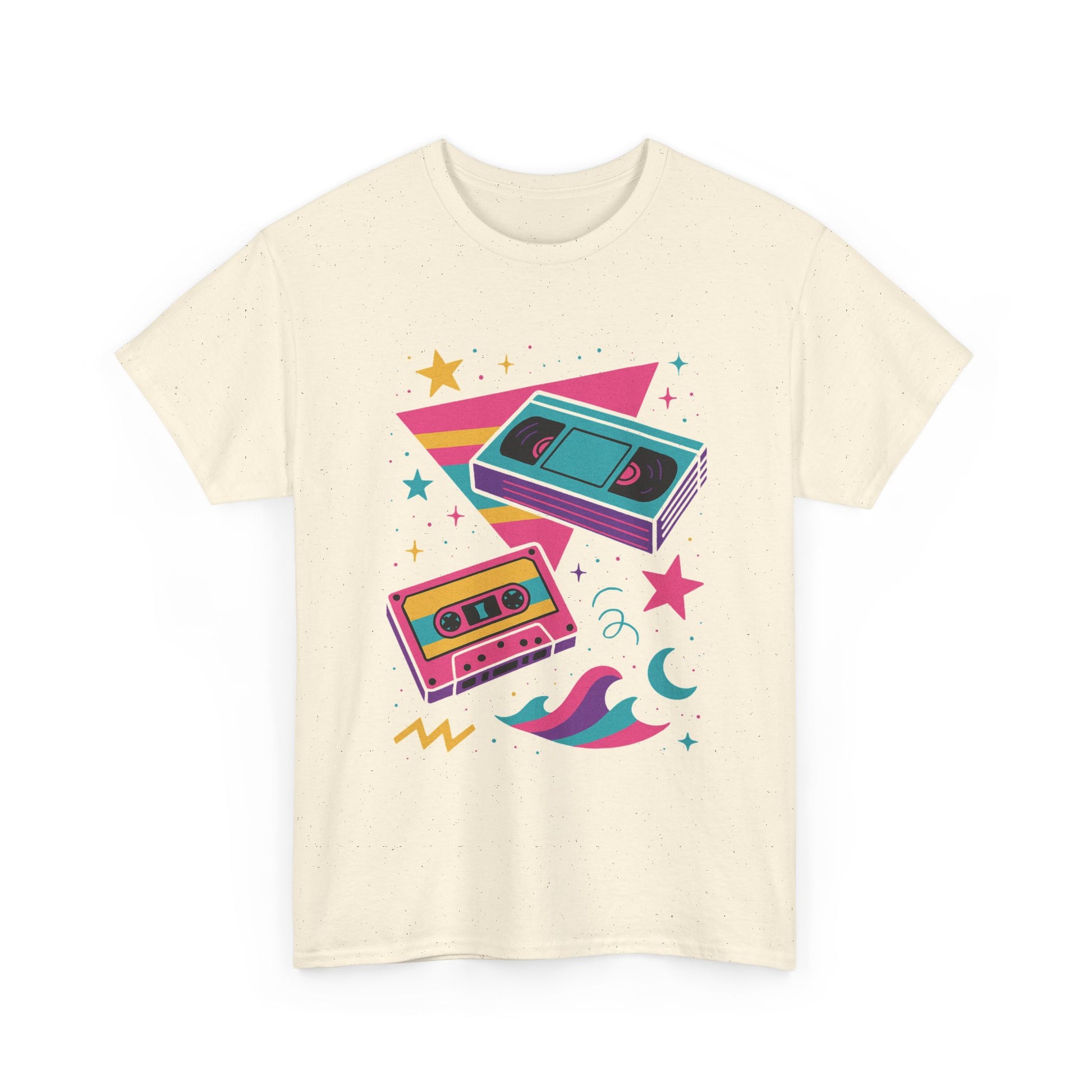 This relaxed classic tee carries a playful, retro energy — neon cassette tapes, crescent moons, and splashy geometric shapes combine into a lighthearted, 80s-inspired scene. Soft, smooth cotton keeps the shirt breathable while the vibrant DTF/DTG prints hold crisp color and detail wash after wash. Wear it on relaxed days when you want a pop of nostalgia: pair with high-waisted jeans, a denim jacket, or layered under an open flannel. The design feels like a mixtape for the weekend — bright, nostalgic, and a little bit dreamy.